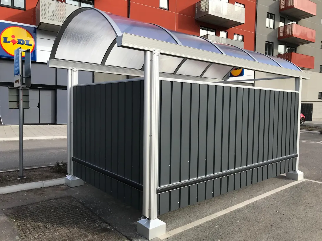 Enkelgarage med bakre gavel med plats för 45 kundvagnar.