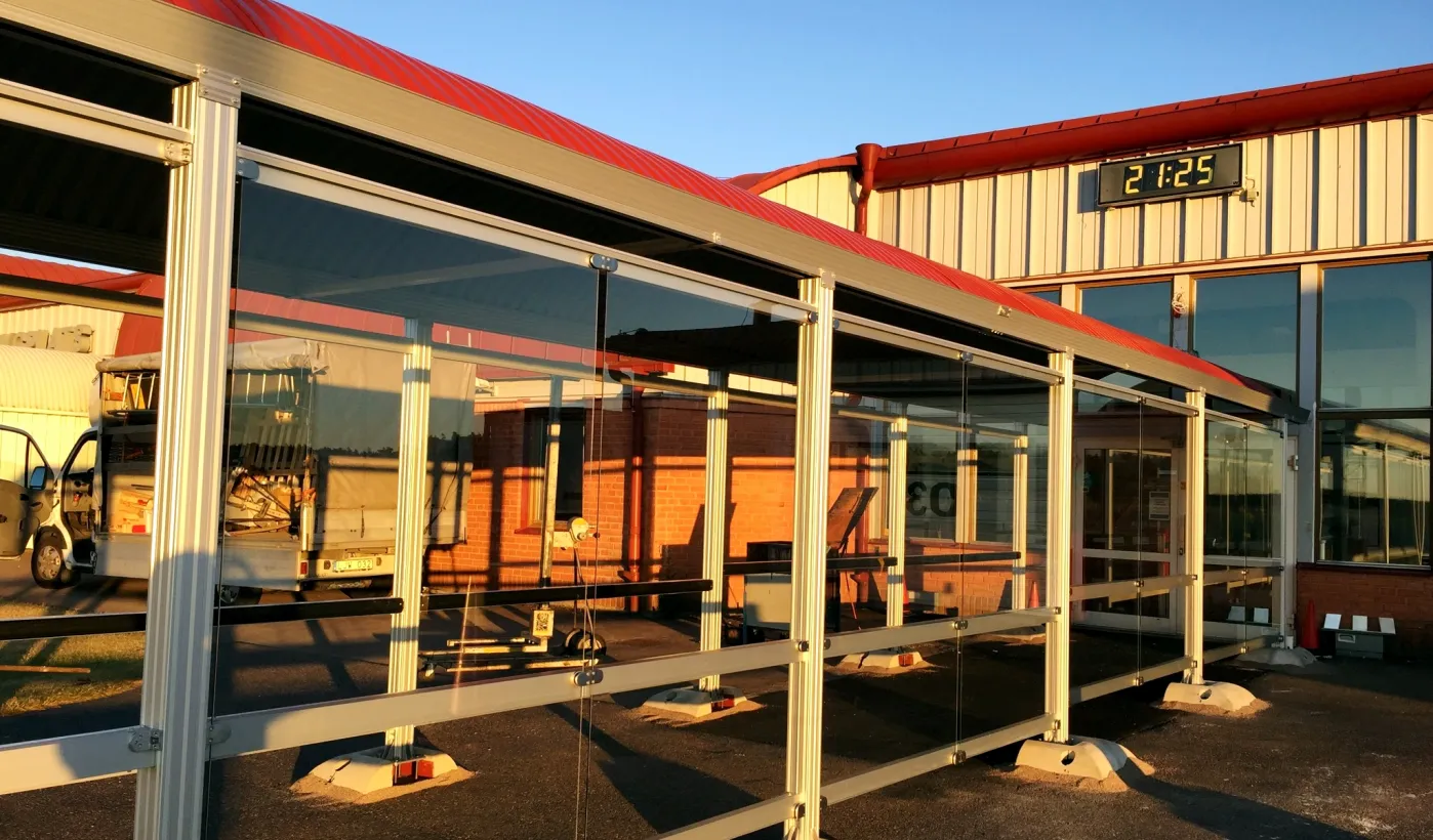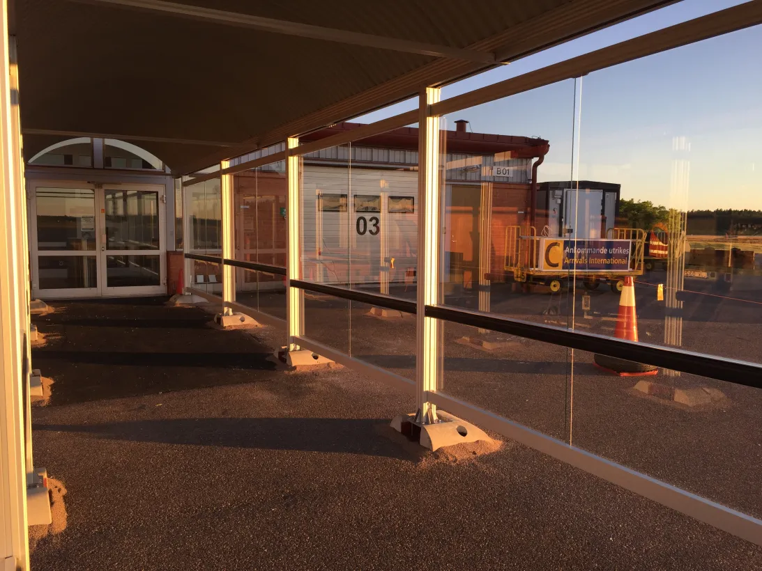 ”Landgång” på Jönköpings flygplats vid ankomst från utlandet. Vägg av härdat glas på en långsida.